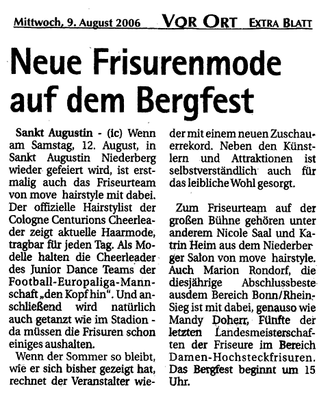 Bei strahlendem Sonnenschein fand am 12. August das Bergfest am Niederberg statt. Die Straße wurde gesperrt und wurde zu einer großen Bühne für Kabarett, Musik und natürlich Haartrends. So zeigte das Team von move hairstyle unterstützt von Petra Keßler noch einmal die Styles der Saison 2006. Eigens angereist waren auch die Junior Dancers der Cologne Centurions, um sich von ihren Friseuren stylen zu lassen. Mit dabei auch Werner Hippler, NFL-Profi und Spieler des Kölner Teams. Download der Presseinformation Zum betrachten der Presseinformationen benötigen